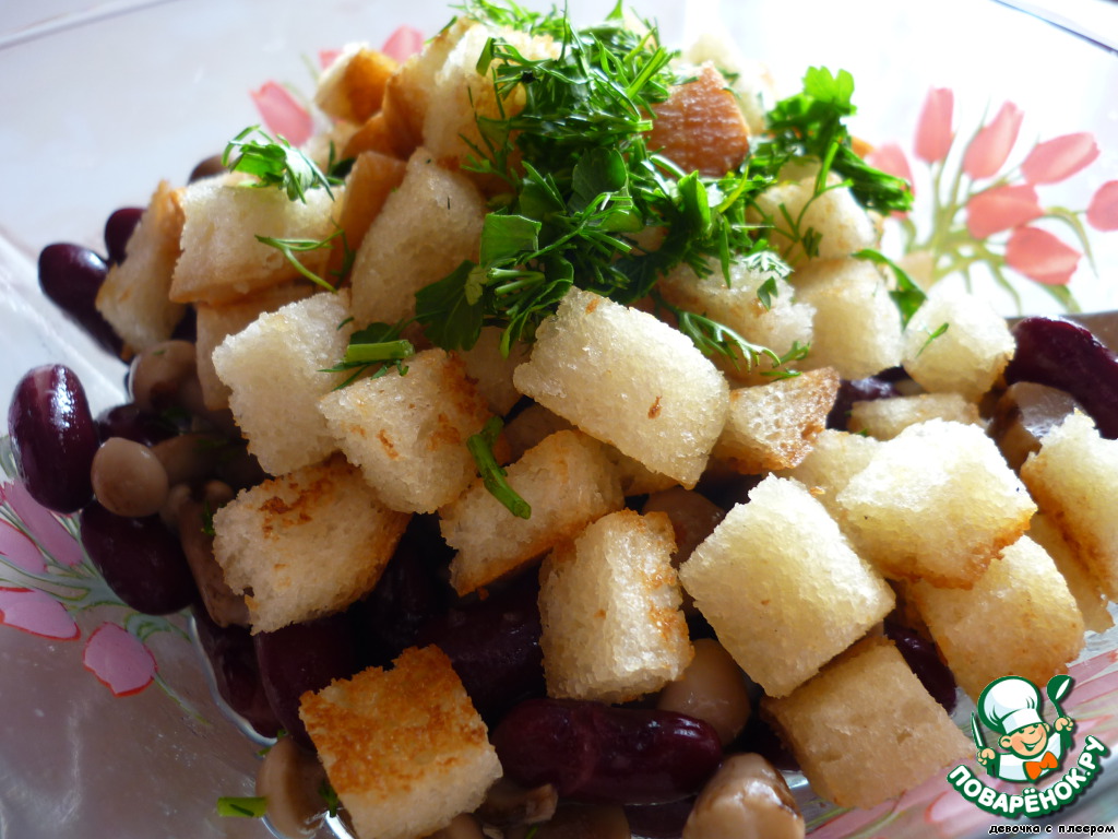 Фасоль с опятами залить заправкой, слегка перемешать. Посыпать салат приготовленными гренками, посыпать зеленью.