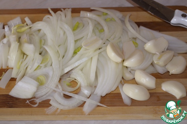 Лук почистить и порезать полукольцами, чеснок почистить и порезать на поперек. В сковороду налить растительного масла, нагреть. Выложить чеснок и лук, на среднем огне начинаем обжаривать.