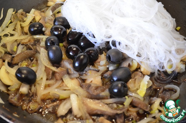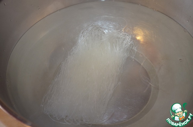 В это время фунчозу заливаем кипятком, она должна как минимум 5 минут пропариться. Пока фунчоза настаивается, мы продолжаем готовить.
