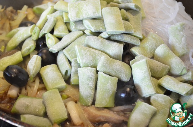 Выкладываем зеленую резаную замороженную фасоль лоби, солим, перчим. Весь процесс обжаривания у меня занял около 7-8 минут.