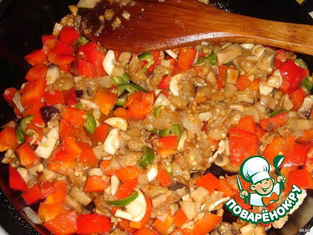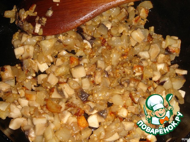 На растительном масле обжарить измельченные баклажаны с измельченными шампиньонами.