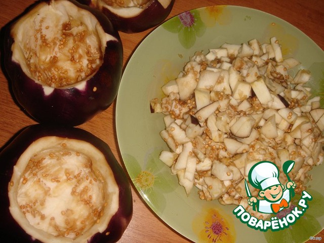 Необходимо у них аккуратно вынуть серединку, я вынимала ложкой. То, что вынули, измельчить.