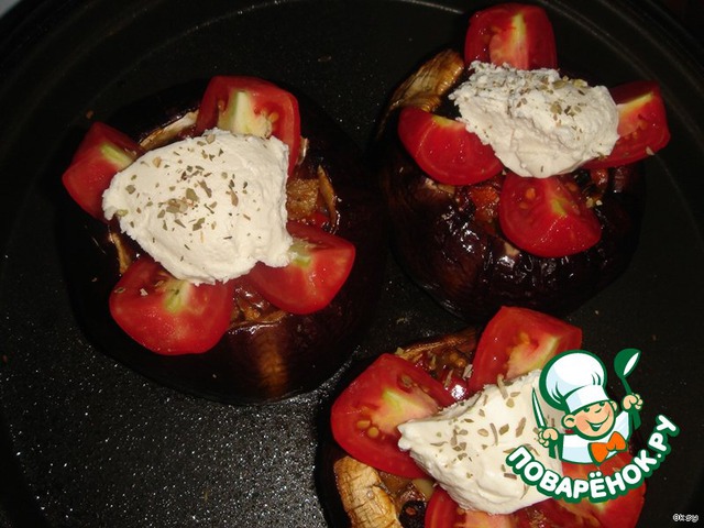 За 5 минут до готовности баклажаны достать. У помидорок ужалить место прикрепления плодоножки и сделать 2 разреза вдоль, но не до конца, чтобы помидор раскрылся как цветочек. Аккуратно водрузить цветок из помидора на баклажан.