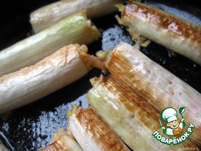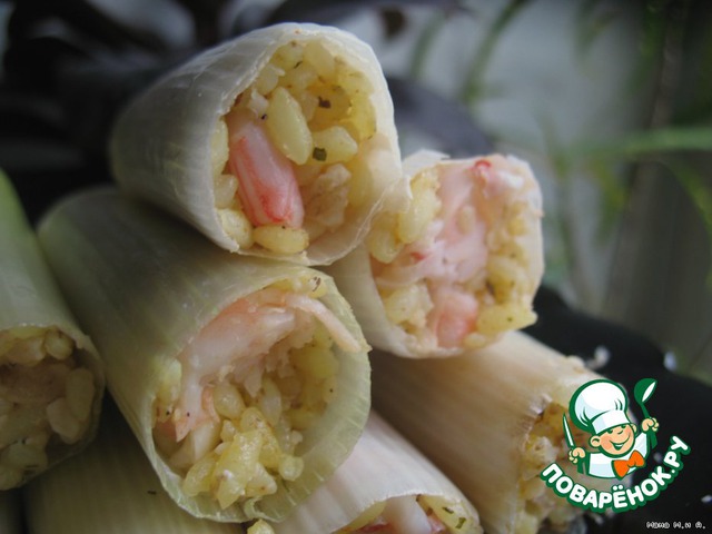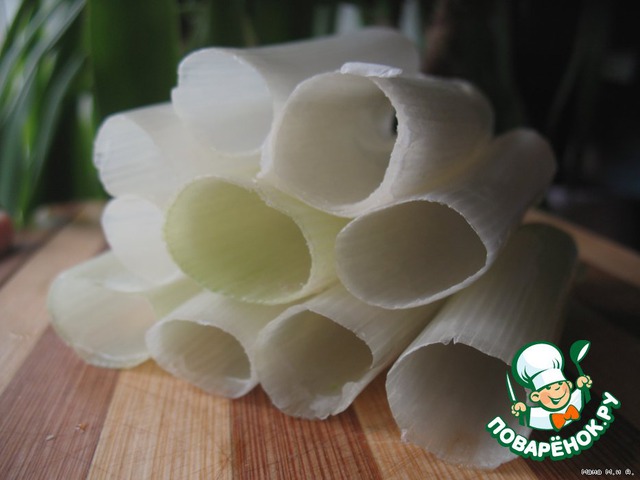 Белую часть порея порубить трубками длиной 7-8 см, разделить на отдельные трубочки, выбрать самые крупные. Тщательно обсушить.