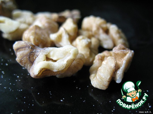 Креветку мелко порубить ножом. Рис сварить и охладить. Также мелко порубить орехи и чеснок.