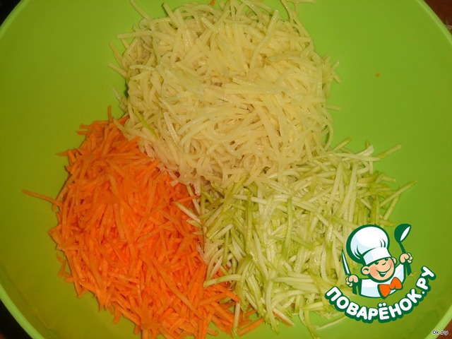 Морковь, картофель и кабачок натереть на терке для корейских салатов.