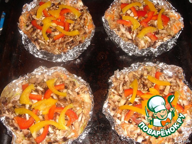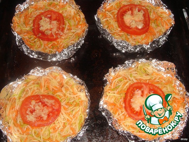 Из фольги подготовить круглые формочки, смазать их растительным маслом и распределить на них овощную смесь. Сверху положить кружочки помидорок, на которые выдавить чеснок.
