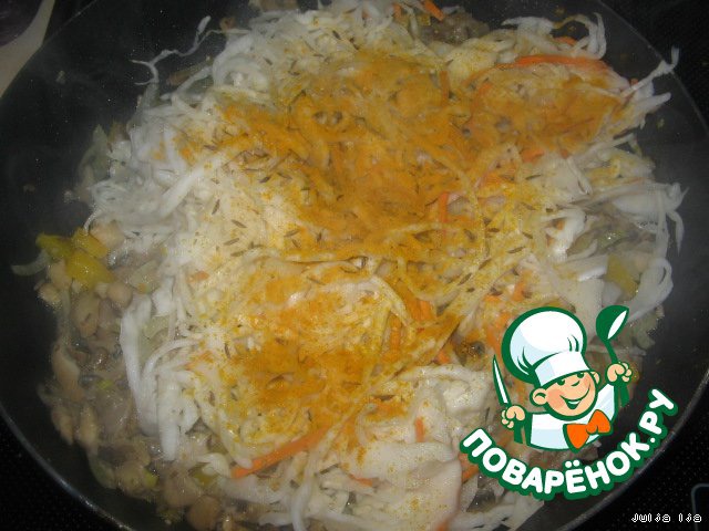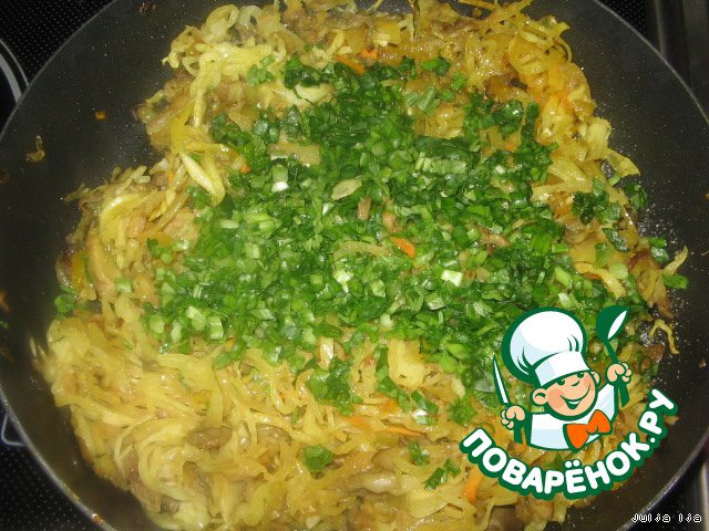 Добавляем квашеную капусту. От рассола сильно можно не отжимать.