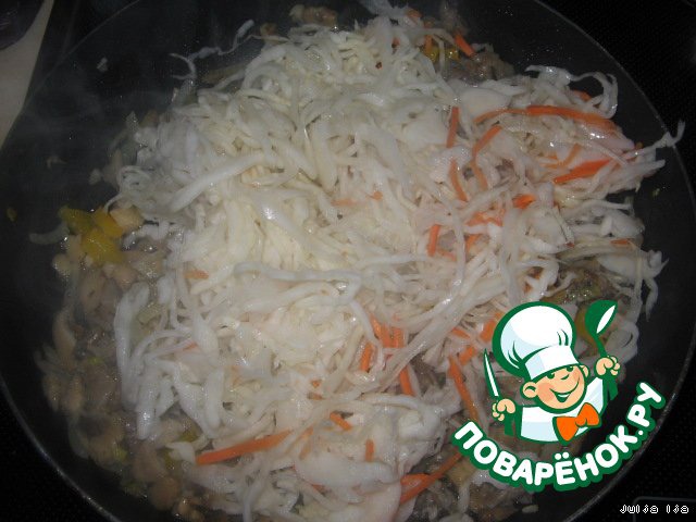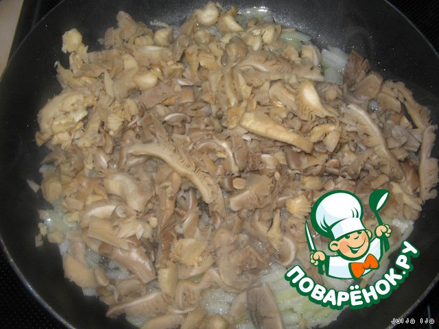 Добавляем грибы, нарезанные соломкой. У меня были вешенки, но можно использовать любые, на Ваш вкус.