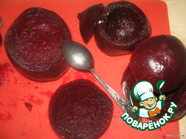 Из предварительно отваренной свеклы, нужно вынуть серединку. Для этого, срезаем верхушку (это будет крышечка горшочка), и чайной ложкой, аккуратно вынимаем серединку, оставляя стенки толщиной 0,5 см. Серединку можно использовать для салата. А мы, с моим малышом, большим любителем свеколки, съели просто так :-[
