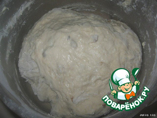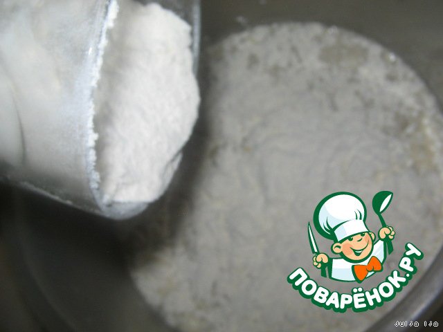 Муку. У меня ушло приблизительно 2,5 стакана, но нужно смотреть по тесту, чтобы оно было упругим, эластичным и сильно не прилипало к рукам. Я добавила сначала 2 стакана, а потом подсыпала понемногу на столе, когда вымешивала тесто руками.