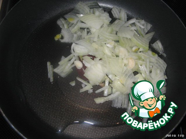 Тем временем, готовим начинку для свеклы. Обжариваем лук, нарезанный соломкой, на растительном масле.