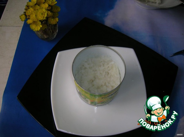 Вокруг риса выкладываем папоротник, украшаем петрушечкой.