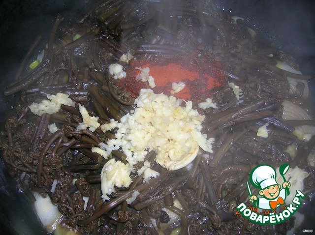 На папоротник выдавливаем чеснок, наливаем соевый соус, насыпаем красный горький перец и глутамат натрия (все говорят, вредно, но я использую его постоянно в острых блюдах).