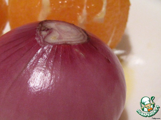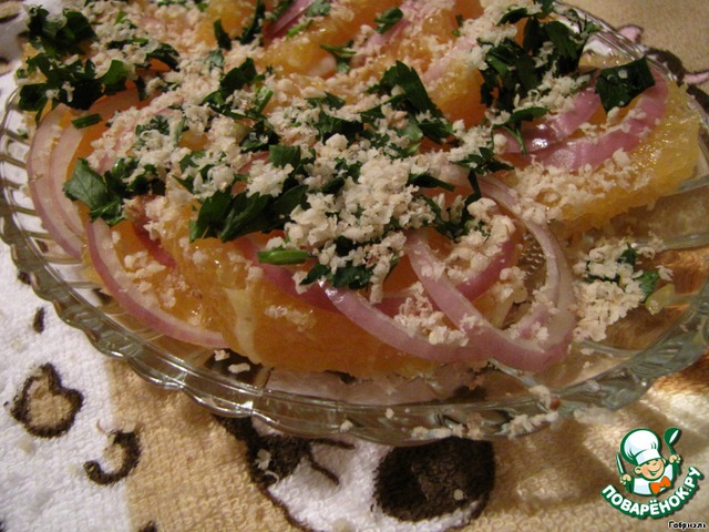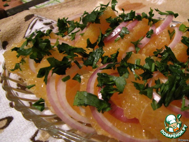Апельсин режем кружочками, выкладываем на блюдо. Посыпаем кольцами лука и нарезанной петрушкой.