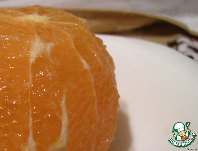 С апельсина обрезаем кожуру ножом так, чтобы снять и пленки долек, оголив мякоть.