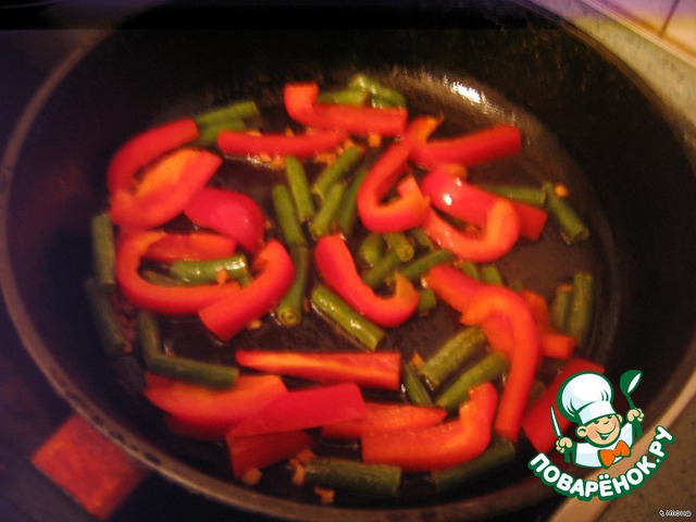 Перчик режем ломтиками (по рецептуре перчик советуют брать зеленый), зеленый лук крупно нарезать наискосок. Подготовить фасоль.