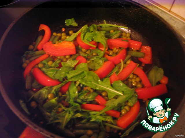 Затем добавляем крупно порванную руколу и зеленый горошек. Прогреть еще минуту.