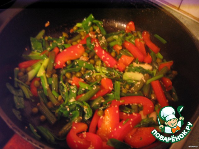 Выложить в сковороду зеленый лук, посыпать кунжутными семечками.