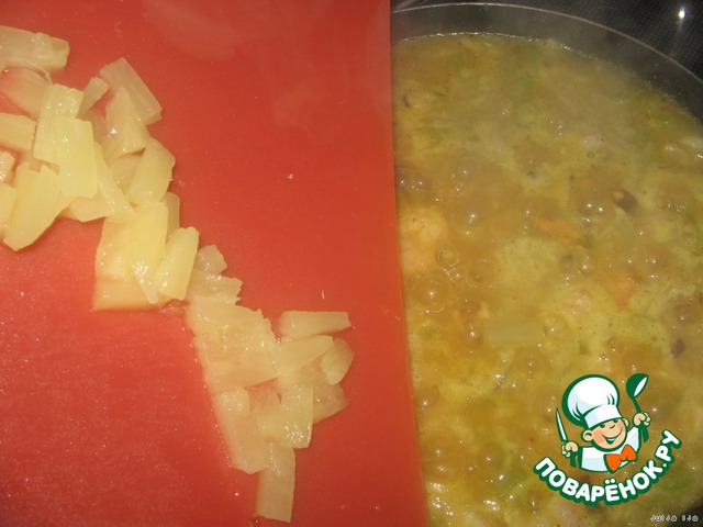 Доводим до кипения. Пару колец ананаса, нарезаем кусочками, кладём к рису.