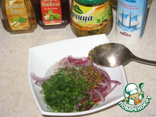 Сделать заливку: смешать уксус белого и красного вина (можно любой на ваш вкус, даже сок лимона),