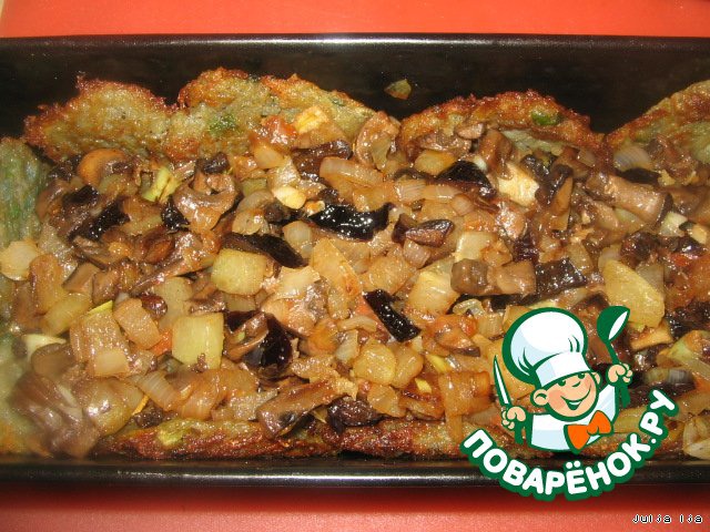 Накрываем оставшимися оладушками. Запекаем, в, разогретой до 180 градусов, духовке, 20 минут.