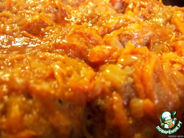 Режем оставшуюся луковицу, трём морковь и обжариваем. Добавляем томатную пасту, специи и готовим соус. Теперь этим соусом заливаем тефтельки.