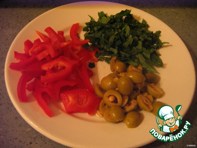 Оливки разрезать пополам, перчик нарезать четвертинками колечек, петрушку порубить.