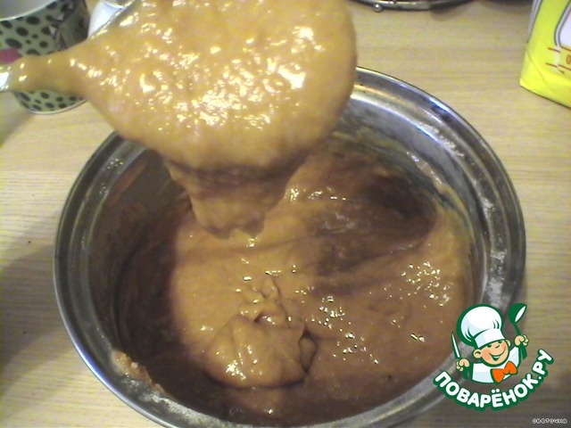 Всыпать примерно четверть стакана муки, смешанной с содой и разрыхлителем. Тесто должно быть густоватое.