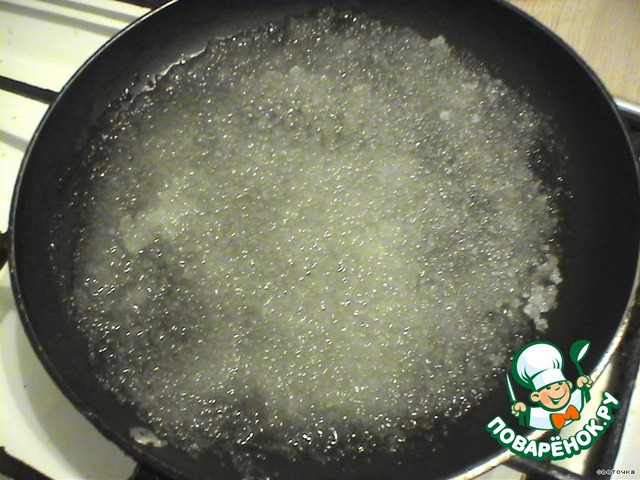 На сковороду вылить масло и насыпать 1 ст сахара, разровнять и поставить на средний огонь.