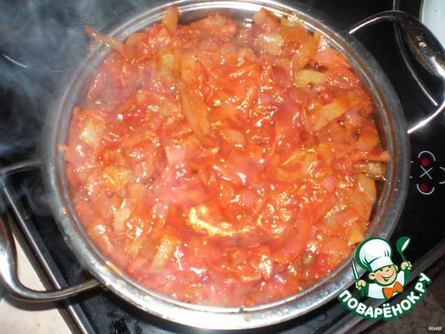 Все ингрeдиенты сложить в кастрюлю, залить томатным соусом,