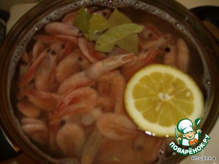 Отвариваем креветки с лавровым листом, перцем горошком, лимоном. Сливаем, остужаем, чистим