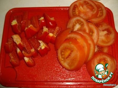 Режем кружочками помидор и кусочками болгарский перчик.