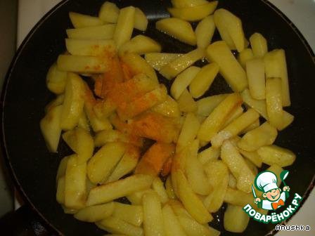 Обжариваем картофель брусочками с добавлением соли и куркумы.