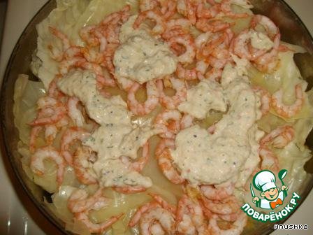 Снова слой капустных листьев. На него креветки и снова соус.