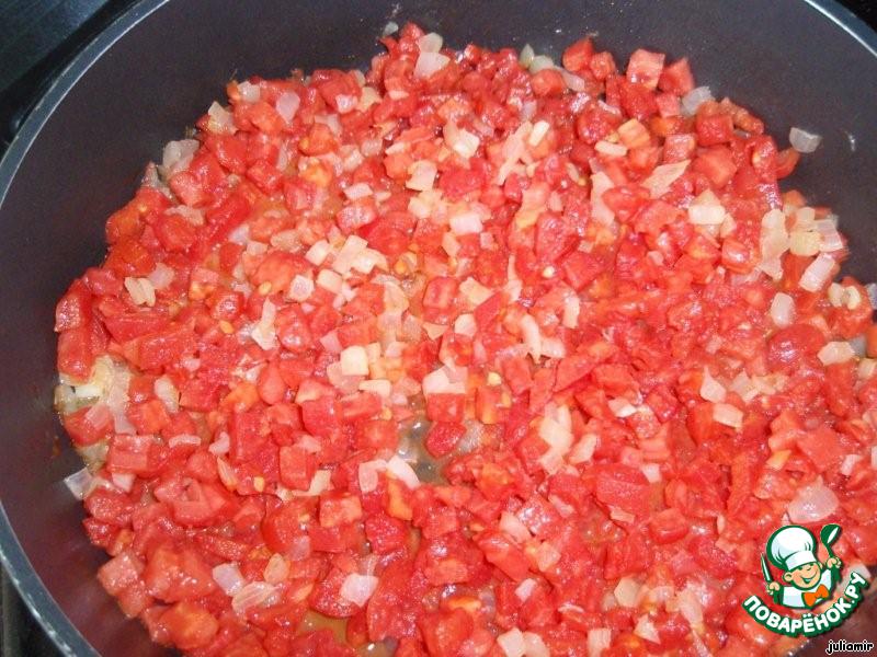 3. Помидоры ошпарить кипятком, почистить и мелко порезать. Добавить к луку и обжарить минут 5.