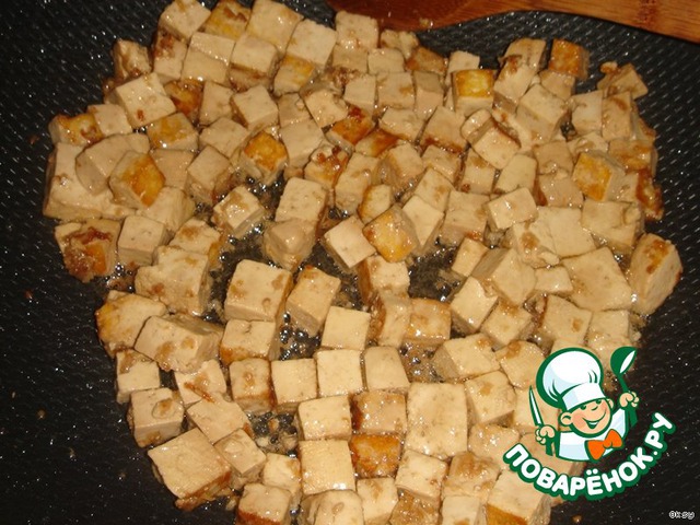 Нагреть подсолнечное масло в вок или сковороде и добавить тофу, обжаривать 5 мин.