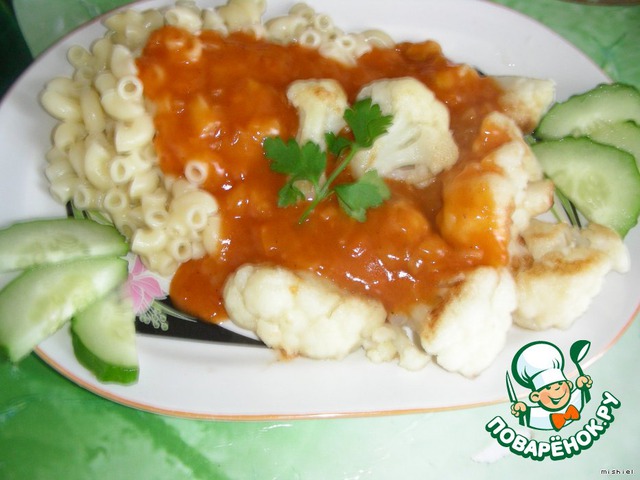 Макароны выкладывают на блюдо, сбоку кладут цветную капусту и поливают луковым соусом.