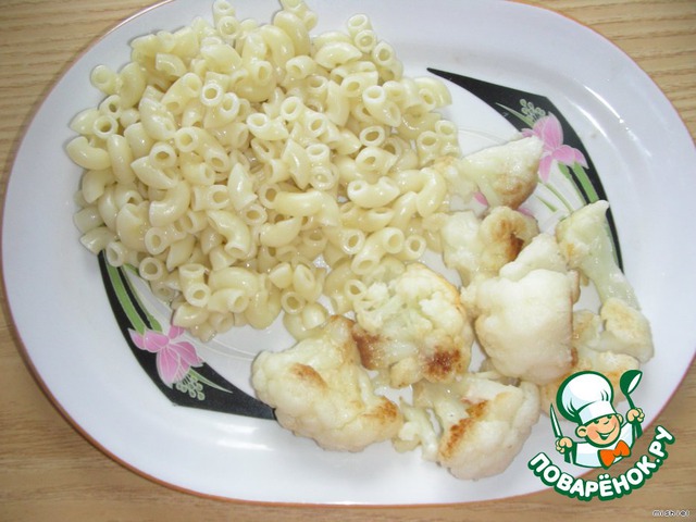 Цветную капусту отварить в подсоленной воде, откинуть на дуршлаг. Я решила еще немного ее и обжарить. В отвар засыпать макароны и отварить до готовности. Можно в воду предварительно добавить немного раст. масла (так как блюдо постное), к тому же после этого их не обязательно промывать.