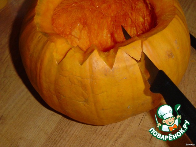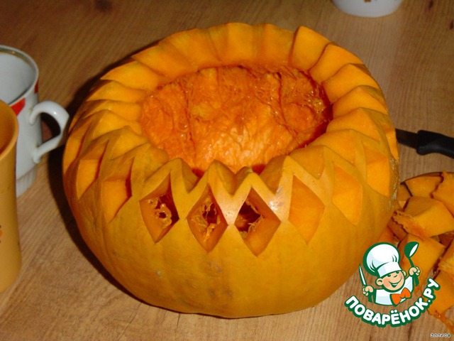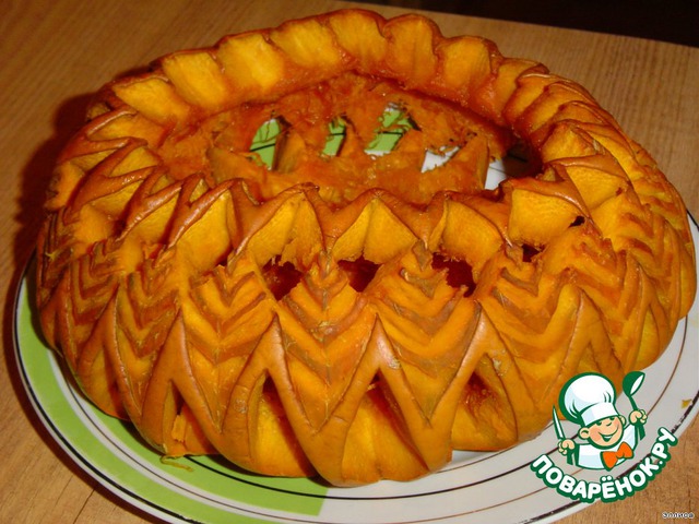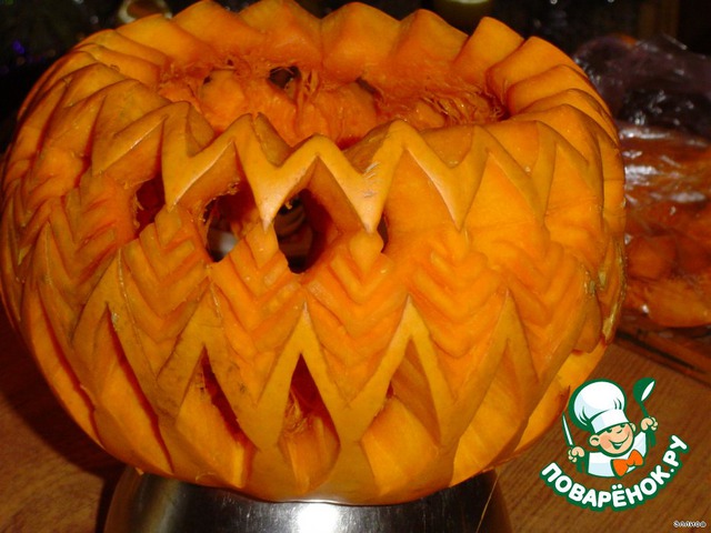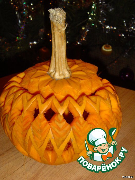 | Такая тыква хорошо смотрится запеченной. Но и как элемент декора - великолепна! Скоро старый Новый год и тыквочка Вам пригодится! Для того, чтобы тыква смотрелась особенно рельефно и ажурно, поместите внутрь горящую свечку. Украшение праздничного стола готово! При вечернем освещении она прекрасно дополнит и украсит Ваш стол, став загадочным и чарующим элементом декора |