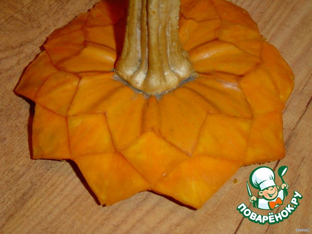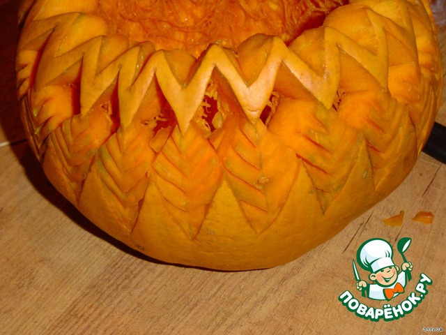 4. Срезаем верхнюю кожицу тыквы по рисунку, слой за слоем. Получится рельефная крышка.