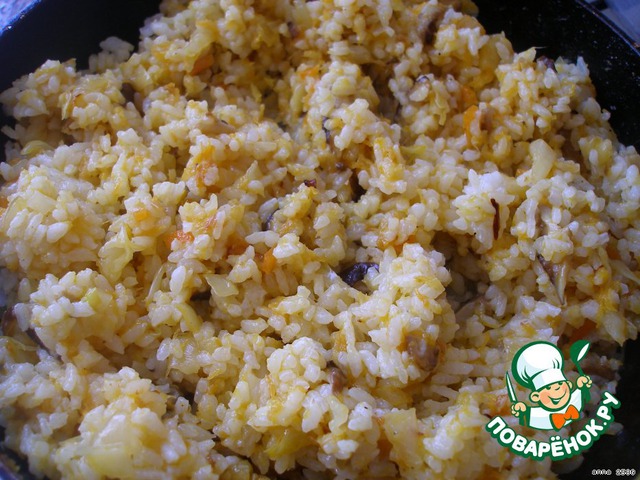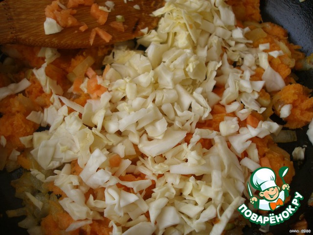 Отварить рис. Пока рис варится, оставшуюся капусту нашинковать тонкими короткими полосками и обжарить в сотейнике на растительном масле с мелко нарезанным луком и натертой на крупной терке морковью.