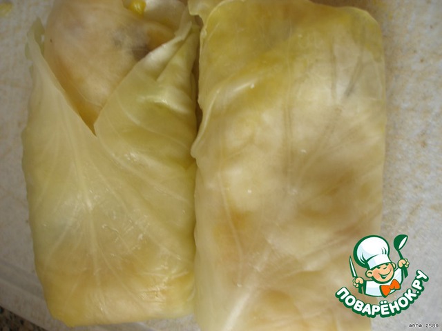 Как только начинка для наших голубцов остыла, кладем на рабочую поверхность капустный лист, на него – столовую ложку начинки, аккуратно лист сворачиваем (если кочан капусты был небольшой и листы получились маленькие, то используем на 1 голубец по 2 капустных листа).