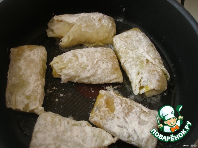 Таким образом сворачиваем все голубцы, слегка обваливаем их в муке и жарим на разогретой сковороде с добавлением растительного масла по 2-3 минуты с каждой стороны.