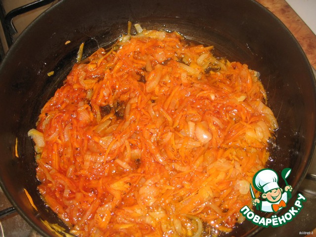 Лук режем полукольцами, морковь на крупной терке. Немного подрумянить лук на растительном масле , потом добавить морковь, посолить, поперчить, пару минут под крышечкой прожарить. Добавить томатный соус или кетчуп (со свежими помидорами мне не очень нравится), хорошо перемешать.