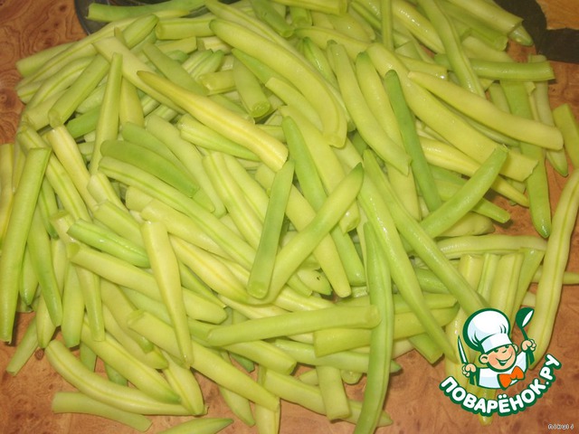 С фасоли убрать кончики, поделить пополам и отварить 5-7 минут в подсоленной воде. Воду слить.