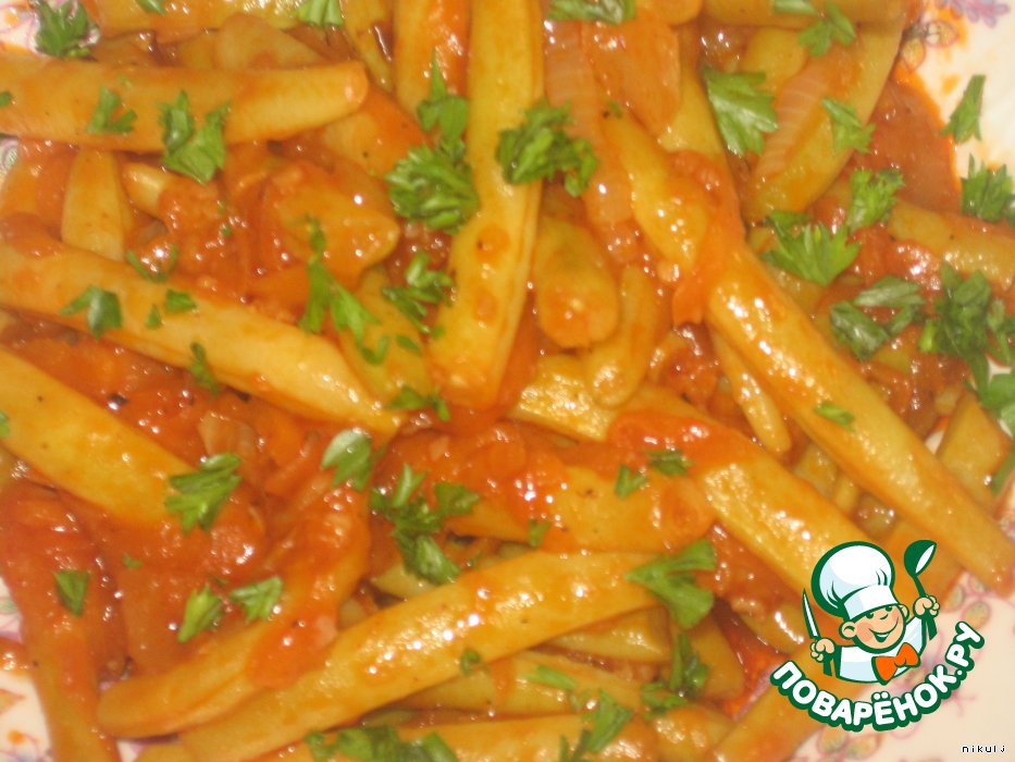| В нашей семье летом овощные блюда - фавориты стола, это одно из них. Очень люблю стручковую фасоль именно в таком сочетании, ее оригинальный вкус, подчеркнутый томатными и чесночными нотками, не оставит равнодушными ее поклонников. Можно подавать как гарнир или как салат. |