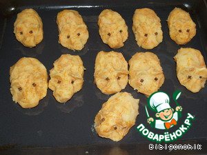 Положить шарики на противень и придаем форму поросят с помощью ложки. В качестве глаз использовать гвоздику. Смазываем желтком и ставим в духовку на 20 минут до образования золотистой корочки.
