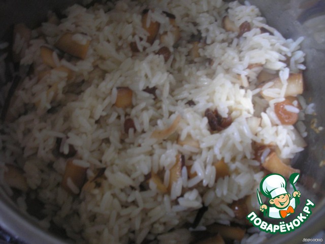 Рис сварился. Выключаем. Даем 5 минут постоять под крышкой. Взбиваем вилкой.