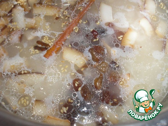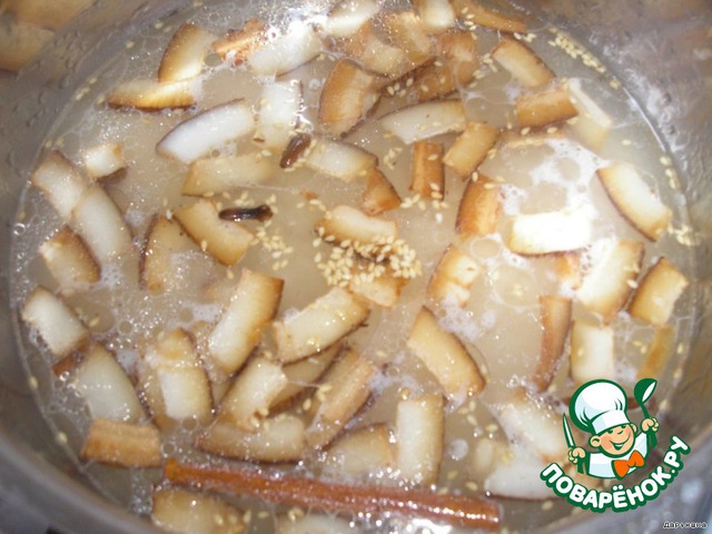 Добавить кунжут, гвоздику. Жарит до золотистого цвета кокоса.